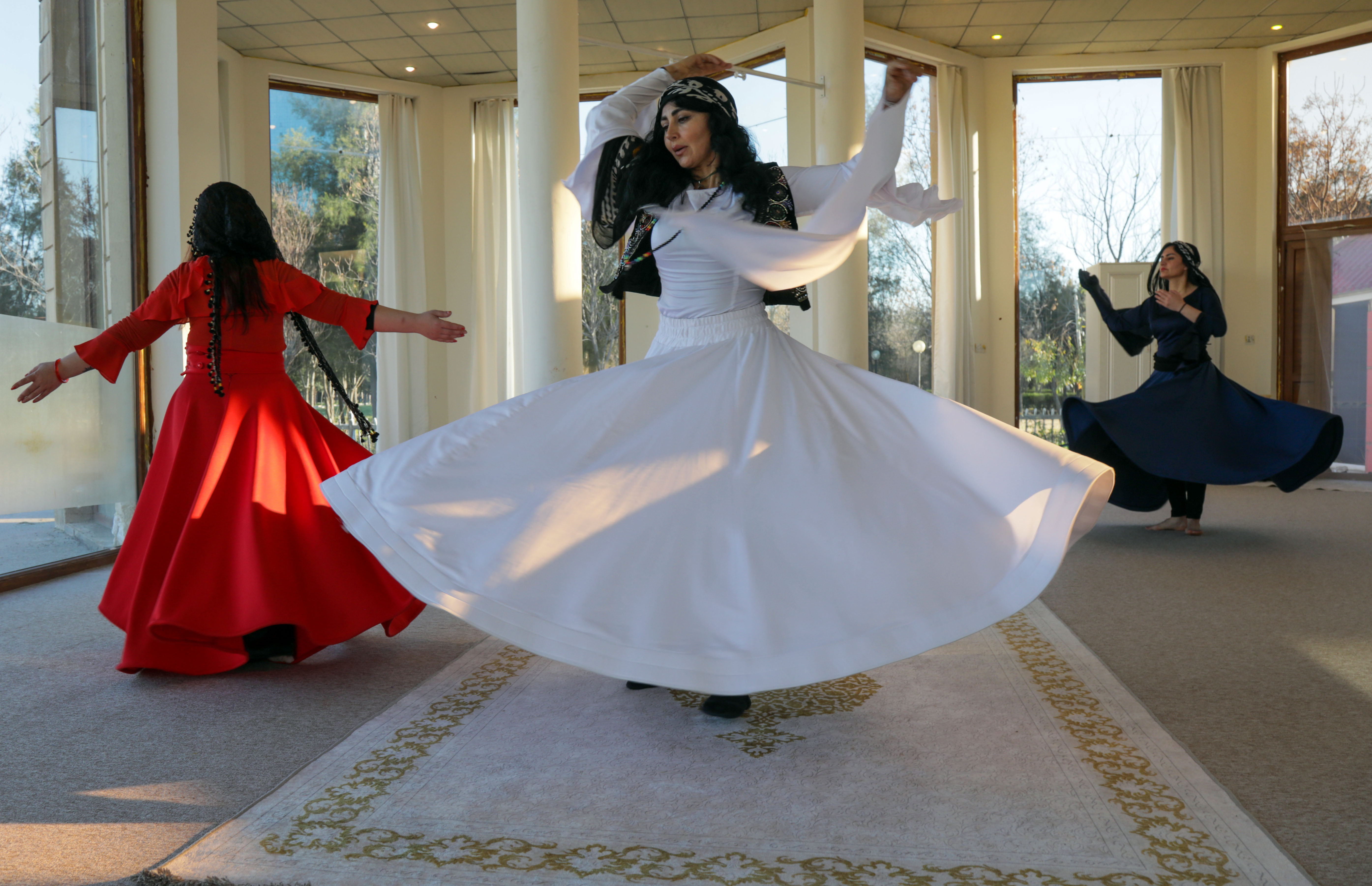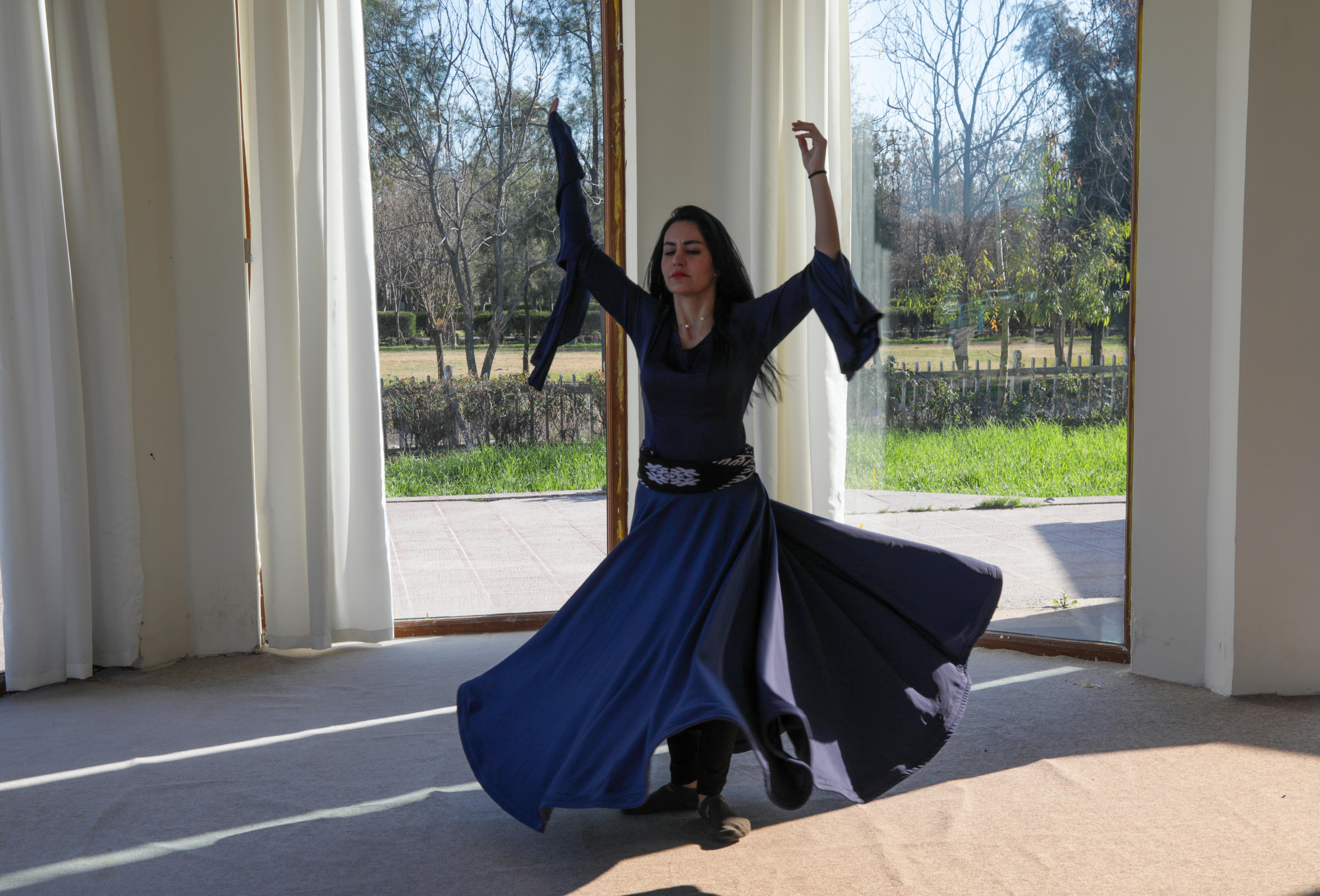 على أنغام موسيقى جميلة، في إحدى الصالات الخاصة الملحقة بجامعة جيهان في أربيل تدور فتاة إيرانية حول نفسها ببطء وهدوء محنية رأسها على كتفها حيناً ثم رافعة وجهها للسماء حيناً آخر باسطة يديها إلى أعلى فيما يشبه الدعاء. تدور وتدور بينما ثوبها الأسود المزين بقطع صغيرة هي عبارة عن مرايا تلمع وتعكس الضوء ينفتح رويداً رويداً كالخيمة.