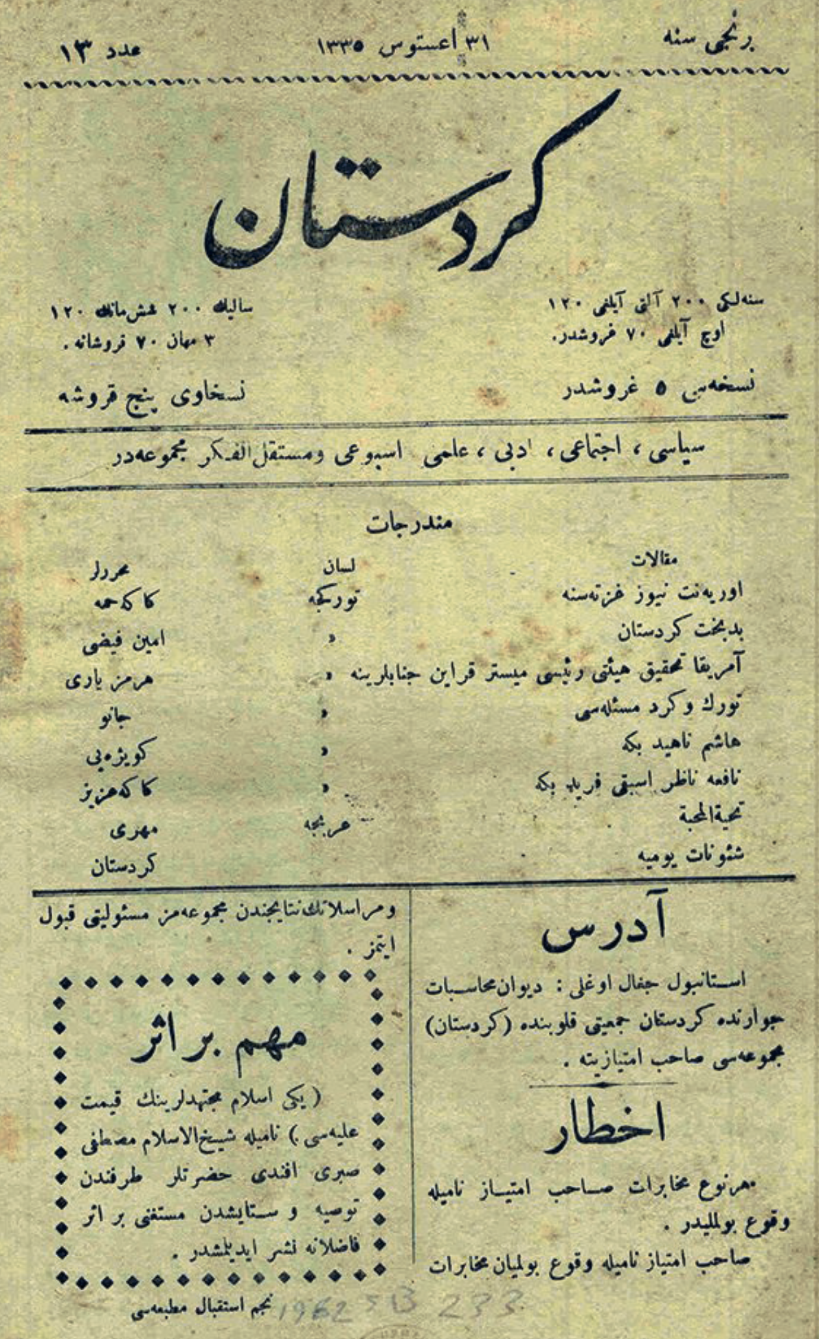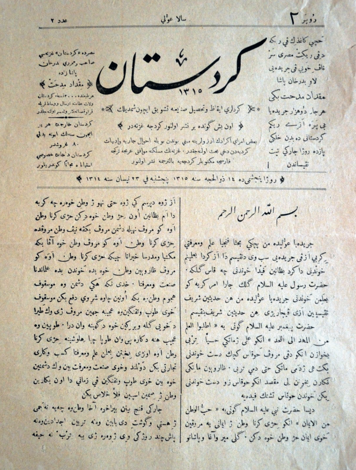 في عام 1898، أنشأ الأمير الكوردي مقداد مدحت بدرخان في القاهرة، أول صحيفة كوردية، سماها «كوردستان». قبل ذلك، كانت اللغة الكوردية تستخدم بشكل رئيسي في الشعر والكلام فقط، أما التعليم والكتابة فكانا باللغات العربية والفارسية والتركية. بعد غزو كوردستان وتقسيمها على يد السلطان سليم الأول العثماني والشاه إسماعيل الصفوي إثر معركة تشالديران في 1514 - 1515، كان الشعب الكوردي، في نهاية المطاف، محروماً من حقوقه الأساسية، بما في ذلك حق النشر بلغته الخاصة.