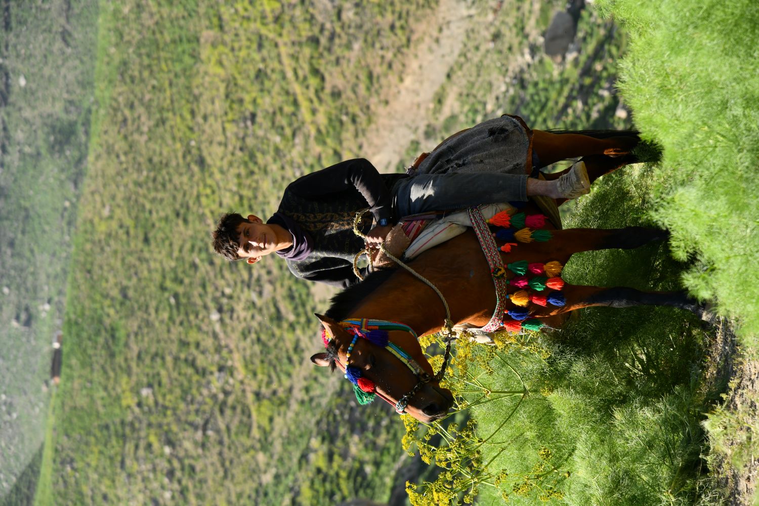 شاب من الكورد الرحل يمتطي حصانه في إحدى المناطق الجبلية بكوردستان العراق