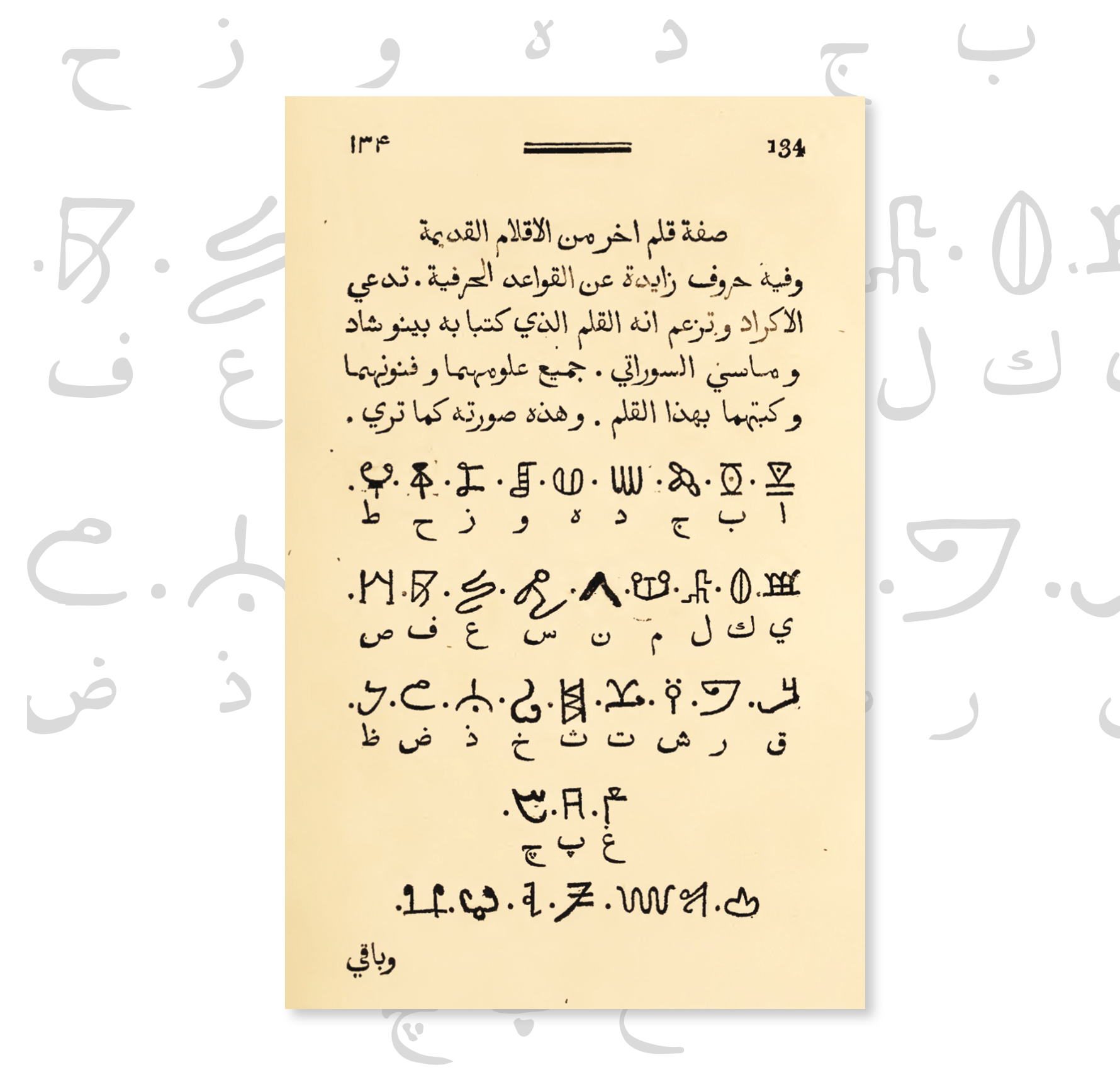 يرد ذكر الكورد في الكتاب أكثر من مرة وتحمل دلالات كبيرة في كشف تاريخ اللغة الكوردية، حيث أنه ختم كتابه، الذي يحوي 69 أبجدية بالأبجدية الكوردية، بقوله: «صفة قلم آخر من الأقلام القديمة وفيه حروف زائدة عن القواعد الحرفية، تدّعي الأكراد وتزعم أنه القلم الذي كتب به بينوشاد وماسي التوراتي جميع علومهما وفنونهما وكُتبهما بهذا القلم».