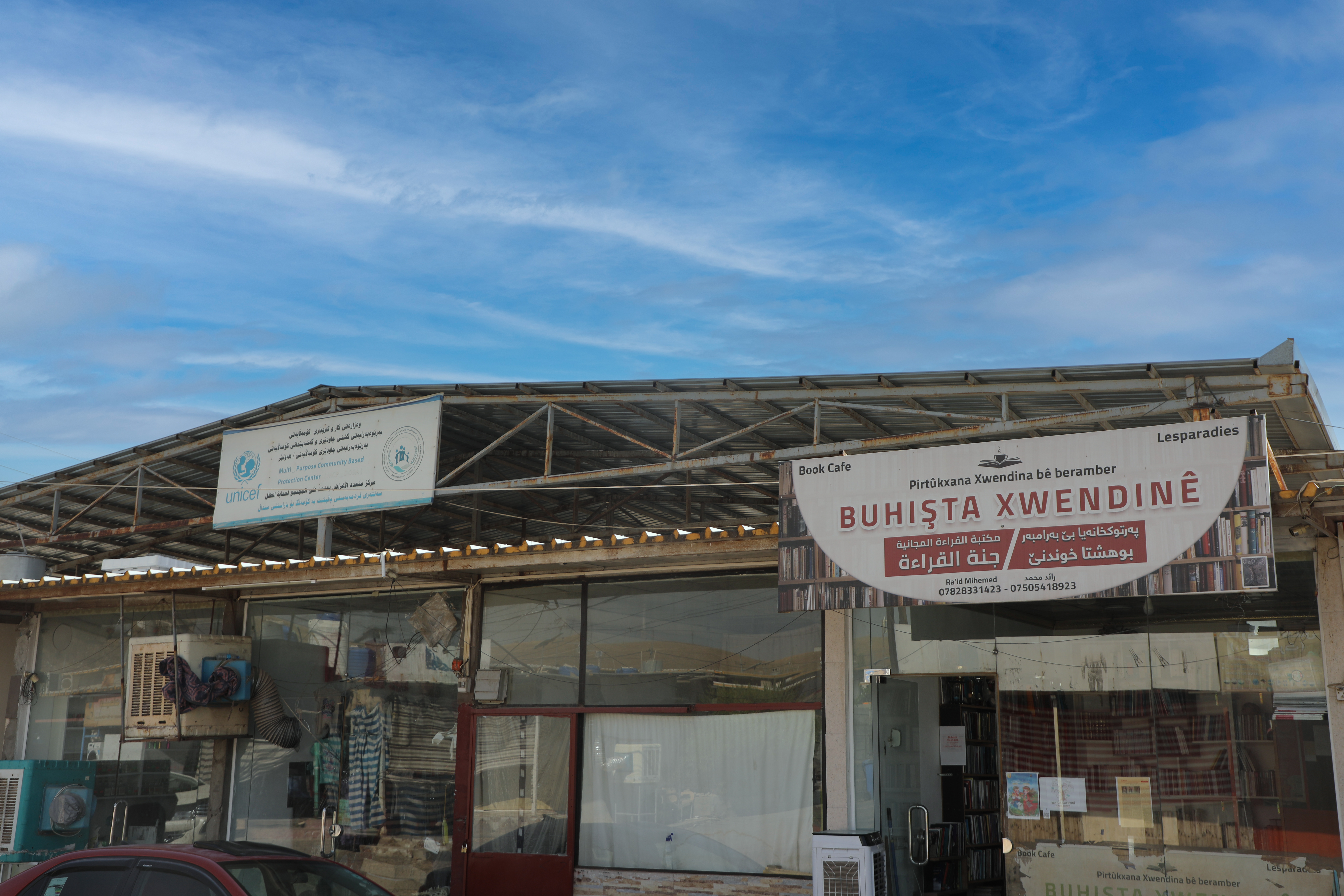 مدخل مكتبة "جنة القراء" في مخيم كوركوسك