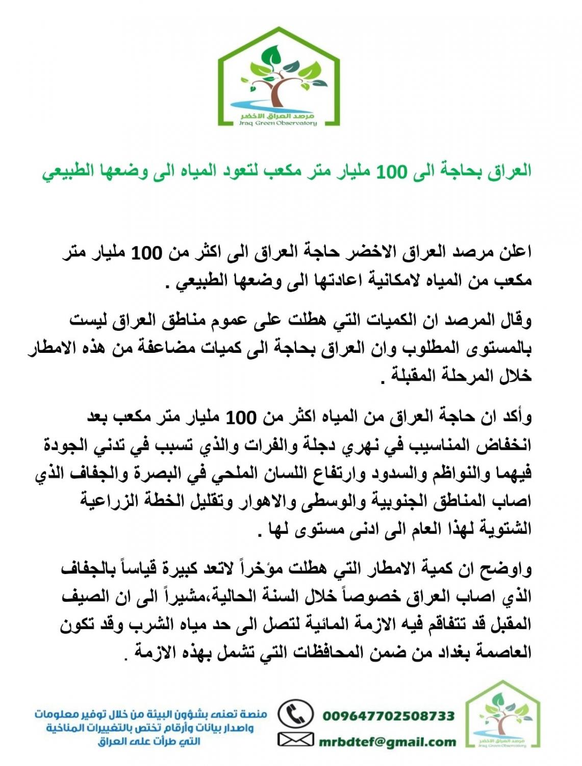 أعلن مرصد العراق الأخضر، أن العراق بحاجة إلى أكثر من 100 مليار متر مكعب من المياه لاستعادة موارده المائية إلى وضعها الطبيعي، محذراً من تفاقم الأزمة الصيف المقبل لدرجة قد تهدد توفّر مياه الشرب.