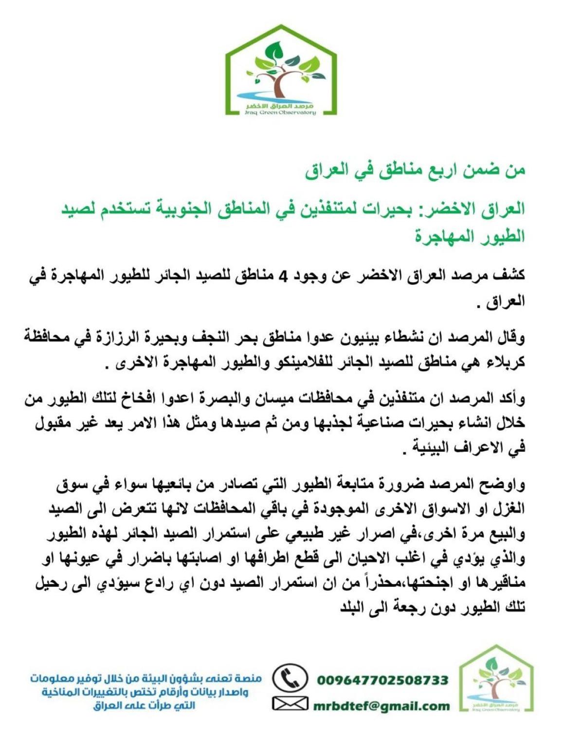 وأكد المرصد أن متنفذين في محافظتي ميسان والبصرة أعدوا أفخاخاً لتلك الطيور من خلال إنشاء بحيرات صناعية لجذبها ثم صيدها، مشيراً إلى أن مثل هذا الأمر يُعد مرفوضاً في الأعراف البيئية.