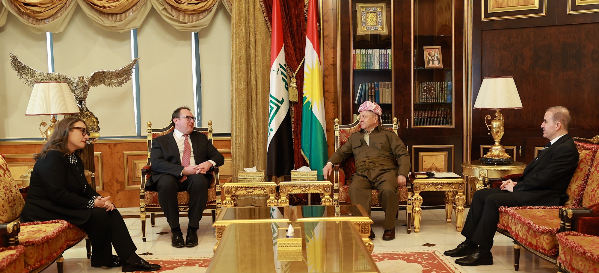 استقبل الرئيس مسعود بارزاني، اليوم الأحد الموافق 1 شباط 2026، في بيرمام، جوشوا هاريس القائم بأعمال السفارة الأمريكية في العراق، وويندي غرين القنصل العام للولايات المتحدة الأمريكية في إقليم كوردستان.