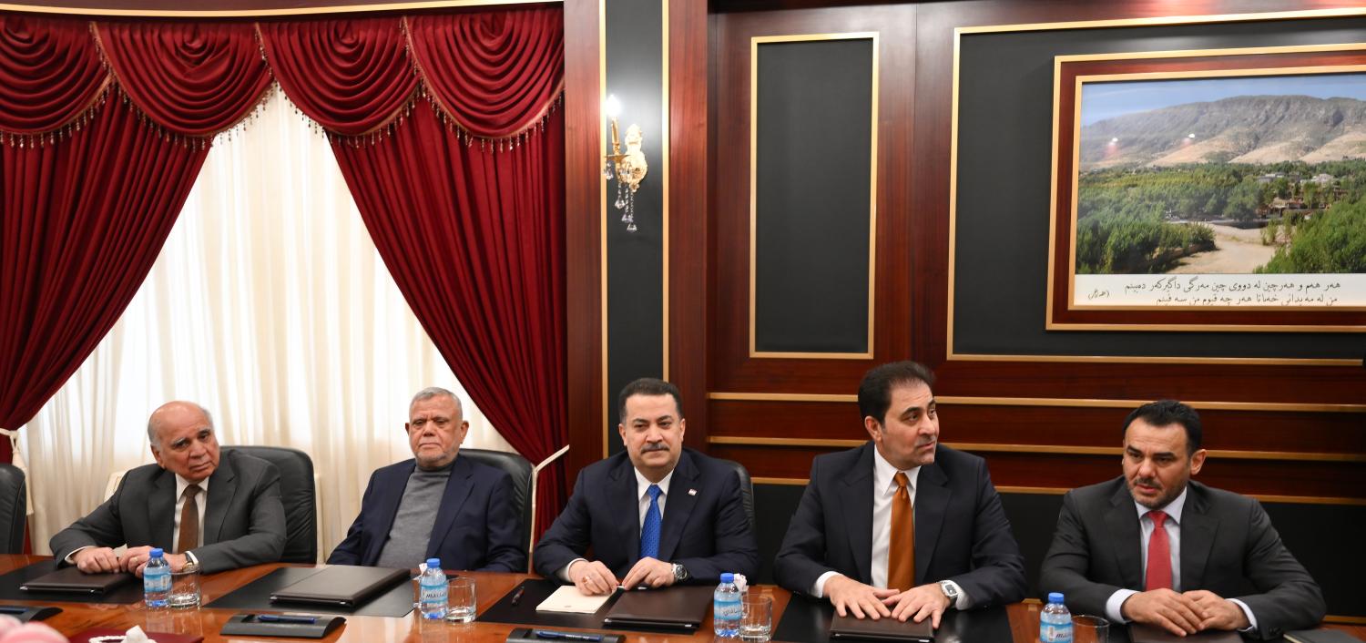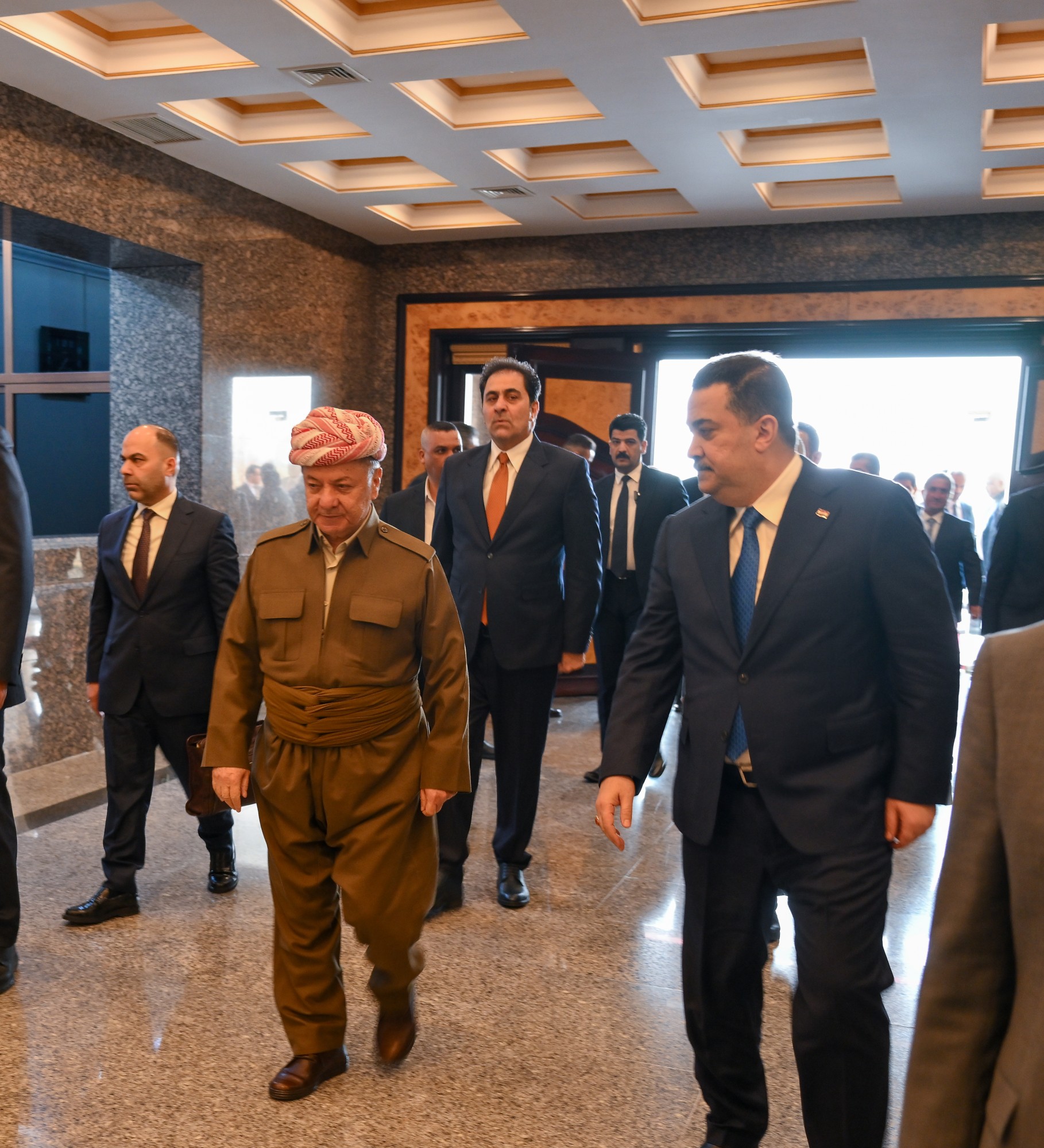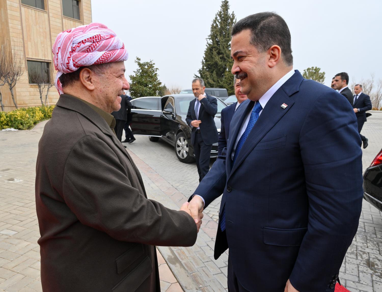 استقبل الرئيس مسعود بارزاني، اليوم الاثنين 2 شباط 2026، في بيرمام، وفداً رفيع المستوى من الإطار التنسيقي، ضمّ كلاً من محمد شياع السوداني رئيس ائتلاف الإعمار والتنمية، وهادي العامري الأمين العام لمنظمة بدر، ومحسن المندلاوي رئيس ائتلاف الأساس، وعباس راضي الأمين العام للإطار التنسيقي.